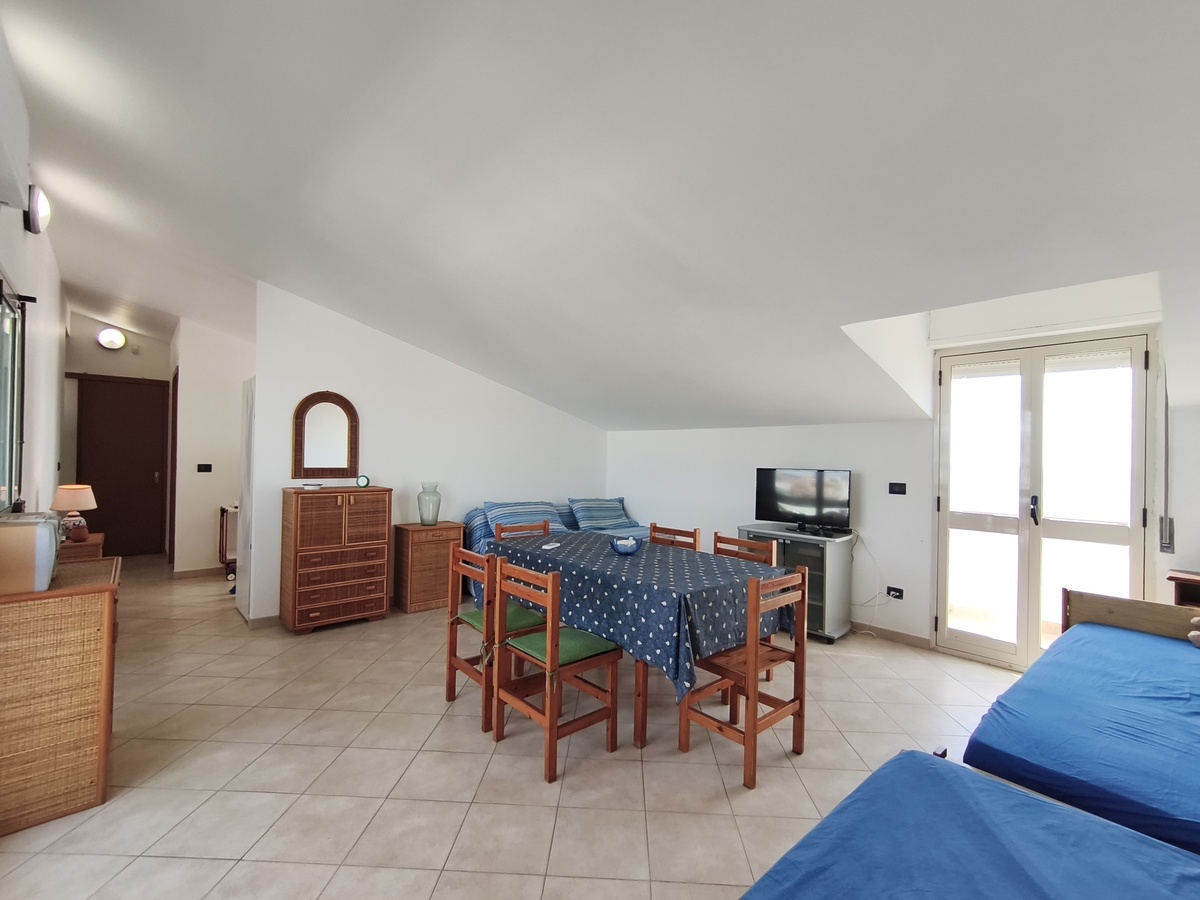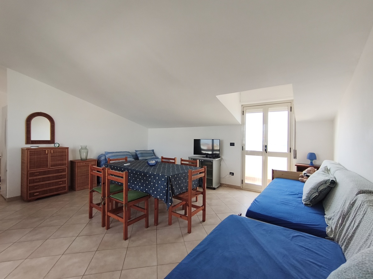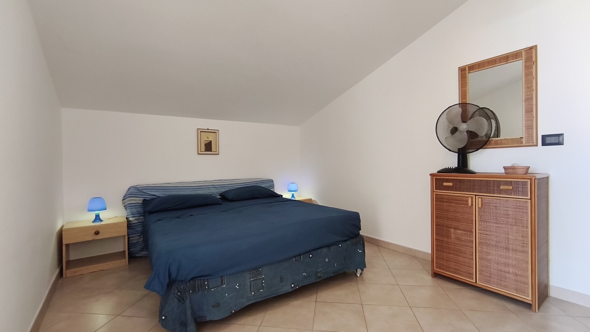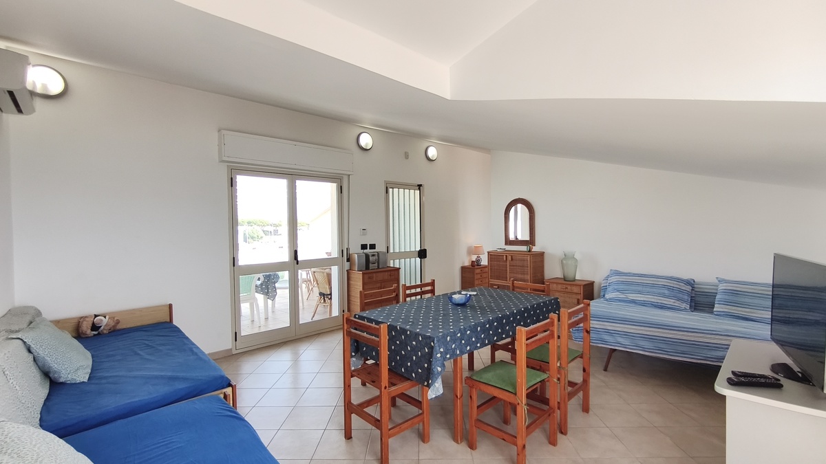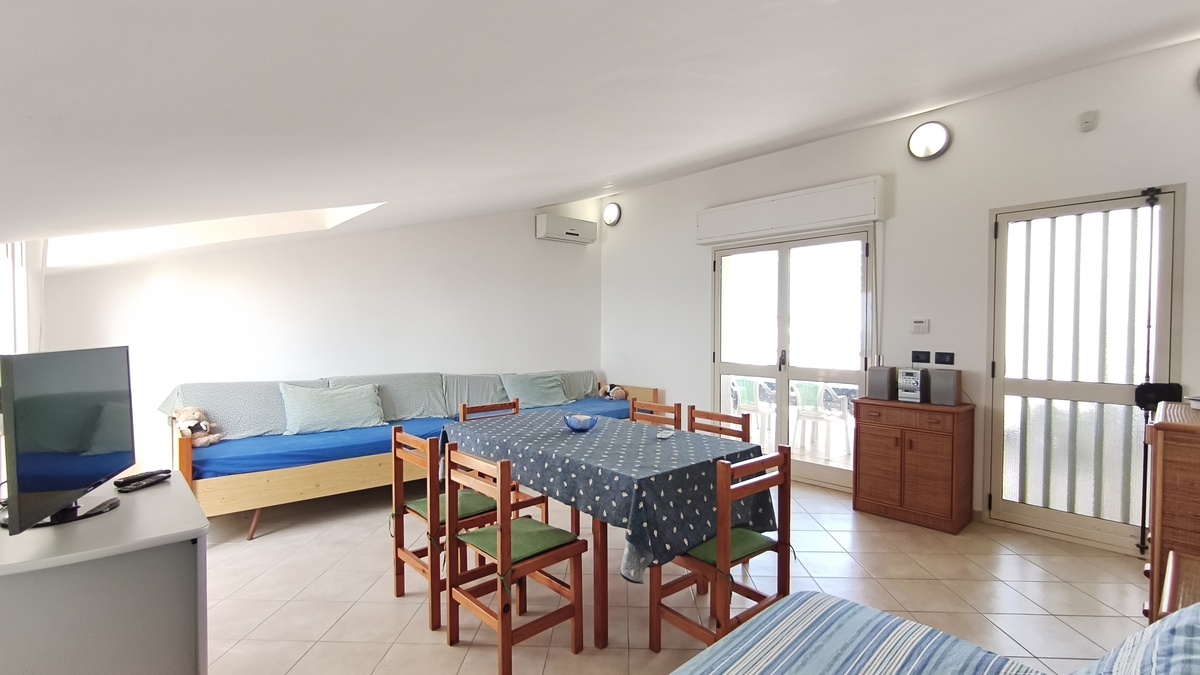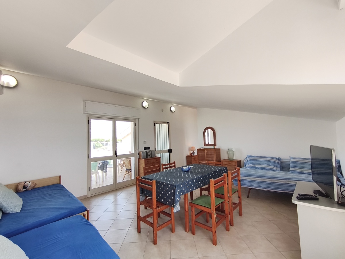 Al secondo piano di questo stabile quasi fronte mare c’è la nostra splendida mansarda con 30 metri quadri di veranda, un ampio soggiorno con comodi divani, tavolo da pranzo e TV full HD e aria condizionata. Cucina completa comunicante con il soggiorno. 2 camere da letto matrimoniali, 1 bagno grande completo con lavatrice ed un piccolo doppio servizio con lavabo e water. Balcone perimetrale x tutta la lunghezza della mansarda. All’esterno del balcone c’è una doccia per quando si rientra dal mare. La casa è arredata con mobili di buona finitura e dotata di tutti i conforts. Climatizzatore e TV full HD nella suite matrimoniale. Parcheggio libero in strada. Situato in una zona tranquilla e sicura, permette un soggiorno in pieno relax perché si arriva in spiaggia (a soli 20 mt.) senza attraversare la strada provinciale. La casa inoltre non è distante dal Lido Selene (bar-ristorante) e dal Lido della Polizia (bar-ristorante con ombrelloni e sdraio) raggiungibili, via spiaggia, in pochi minuti.