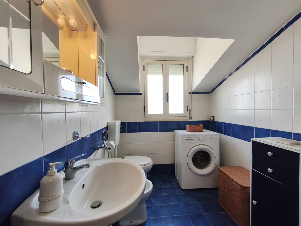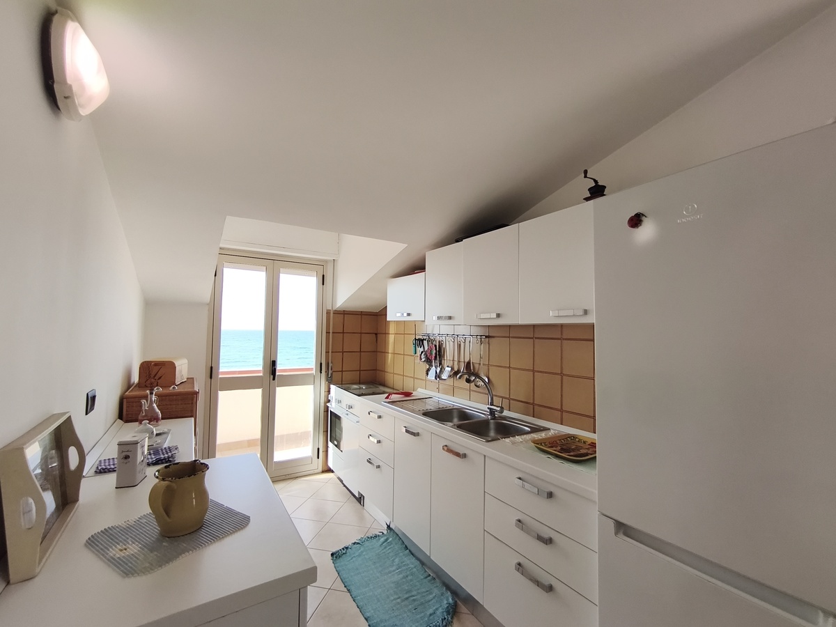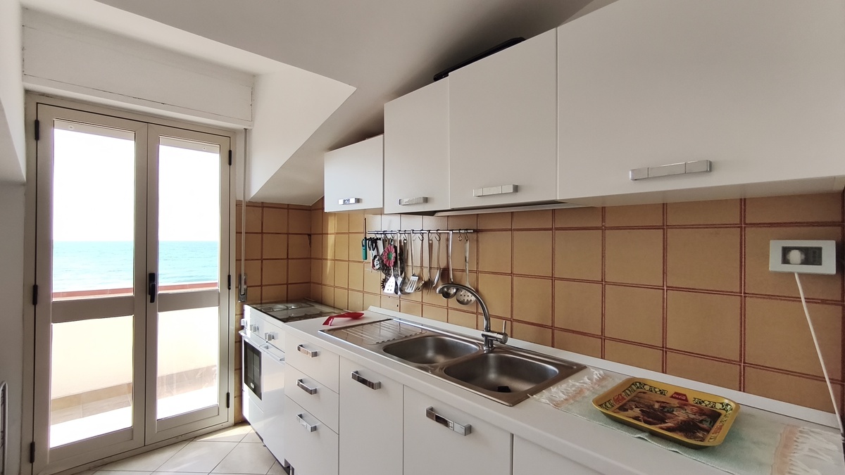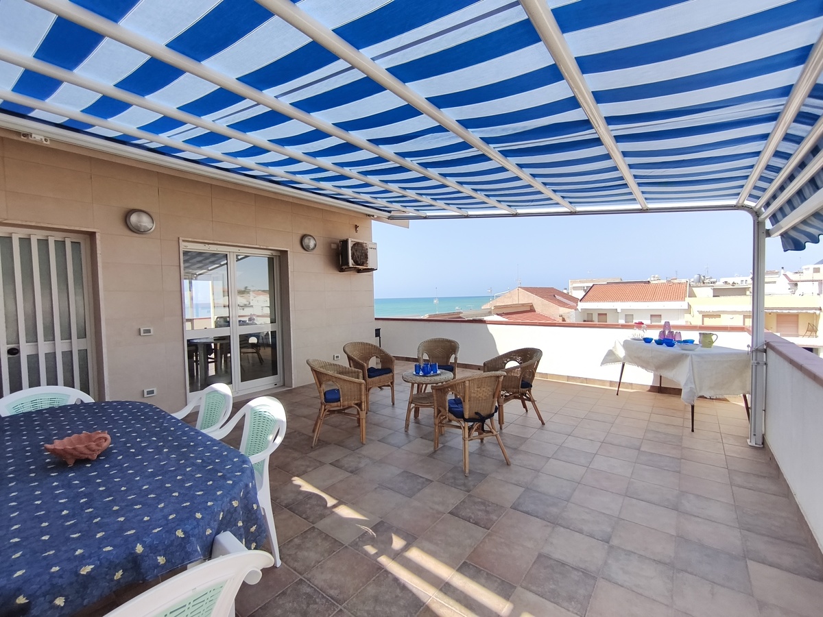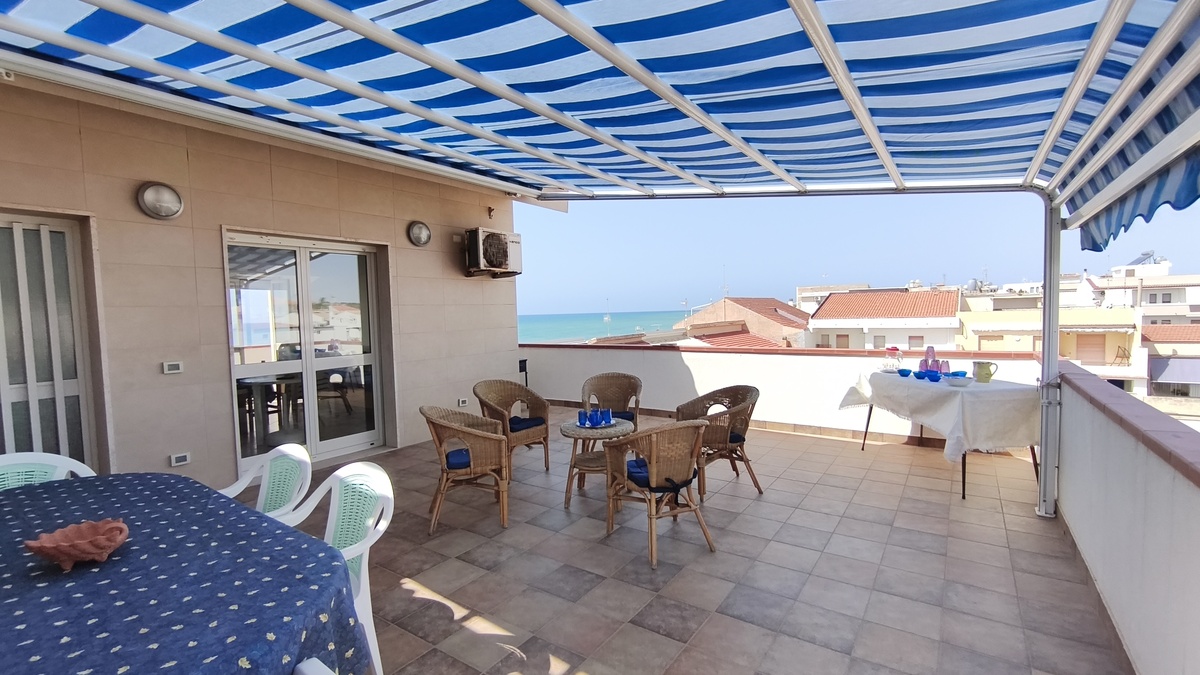 Al secondo piano di questo stabile quasi fronte mare c’è la nostra splendida mansarda con 30 metri quadri di veranda, un ampio soggiorno con comodi divani, tavolo da pranzo e TV full HD e aria condizionata. Cucina completa comunicante con il soggiorno. 2 camere da letto matrimoniali, 1 bagno grande completo con lavatrice ed un piccolo doppio servizio con lavabo e water. Balcone perimetrale x tutta la lunghezza della mansarda. All’esterno del balcone c’è una doccia per quando si rientra dal mare. La casa è arredata con mobili di buona finitura e dotata di tutti i conforts. Climatizzatore e TV full HD nella suite matrimoniale. Parcheggio libero in strada. Situato in una zona tranquilla e sicura, permette un soggiorno in pieno relax perché si arriva in spiaggia (a soli 20 mt.) senza attraversare la strada provinciale. La casa inoltre non è distante dal Lido Selene (bar-ristorante) e dal Lido della Polizia (bar-ristorante con ombrelloni e sdraio) raggiungibili, via spiaggia, in pochi minuti.